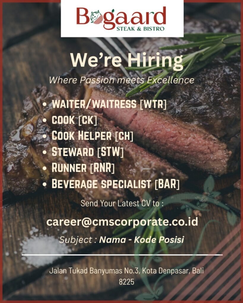 Bogaard STEAK & BISTRO is looking for talented individuals to join our team in Denpasar, Bali! 🇮🇩