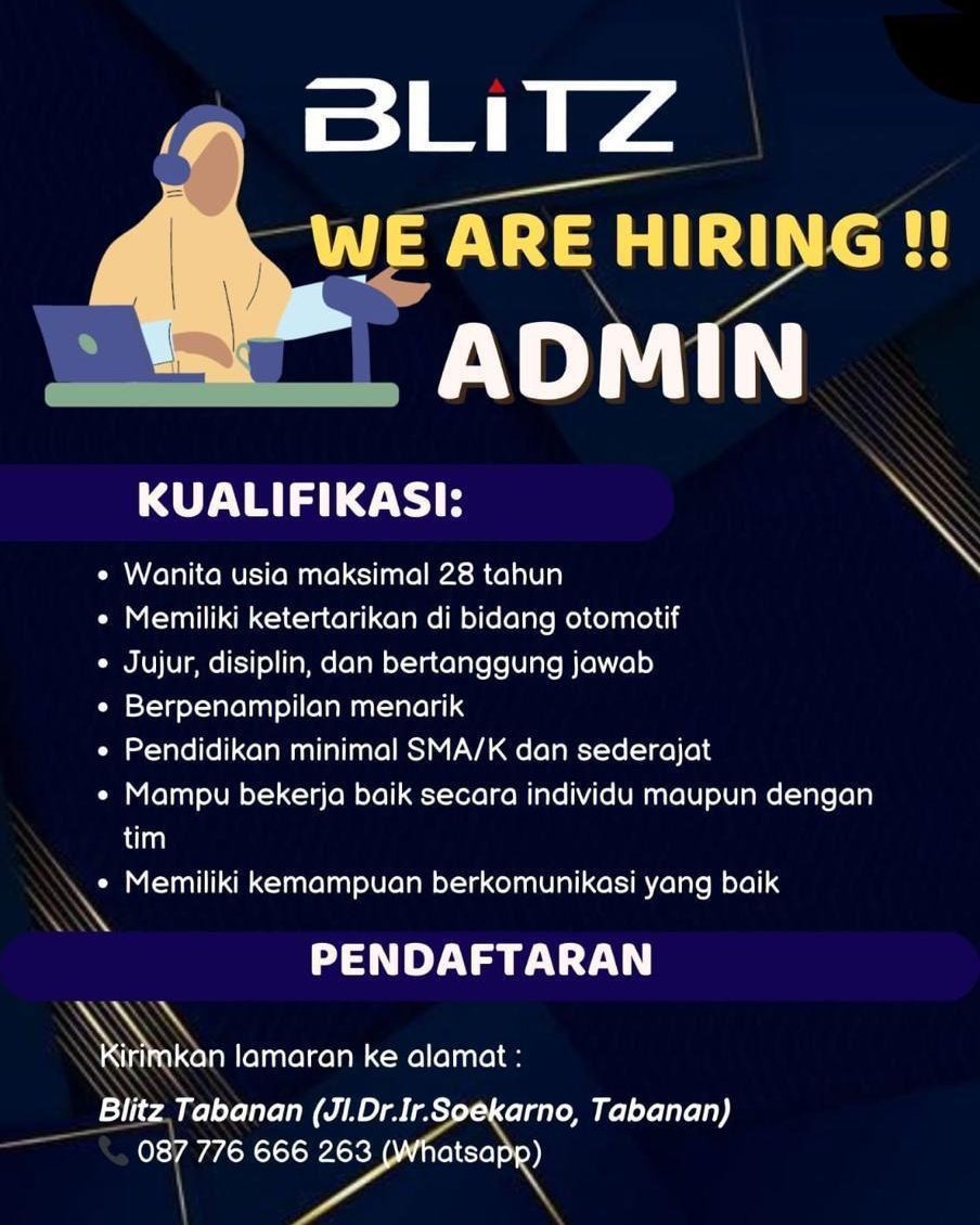 LOKER.BALINEWS.ID, TABANAN – Peluang karir di bidang administrasi kini terbuka bagi talenta muda di wilayah Tabanan dan sekitarnya. BLiTZ Tabanan, yang berlokasi di Jalan Dr. Ir. Soekarno, secara resmi mengumumkan pembukaan rekrutmen untuk posisi Admin guna mendukung operasional perusahaan mereka. Kesempatan ini ditujukan bagi individu yang memiliki ketertarikan kuat pada industri otomotif serta mampu bekerja secara profesional baik secara mandiri maupun di dalam tim.