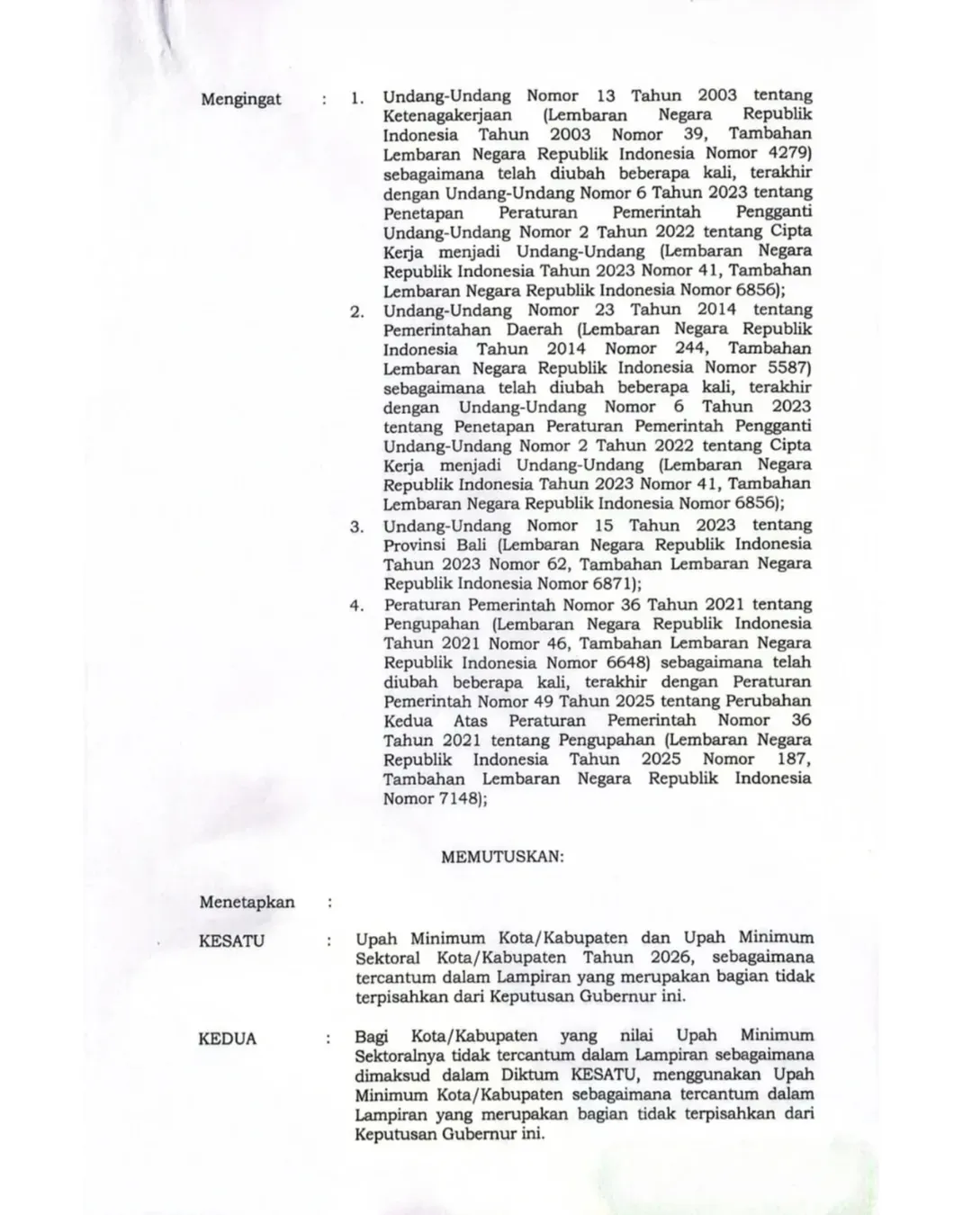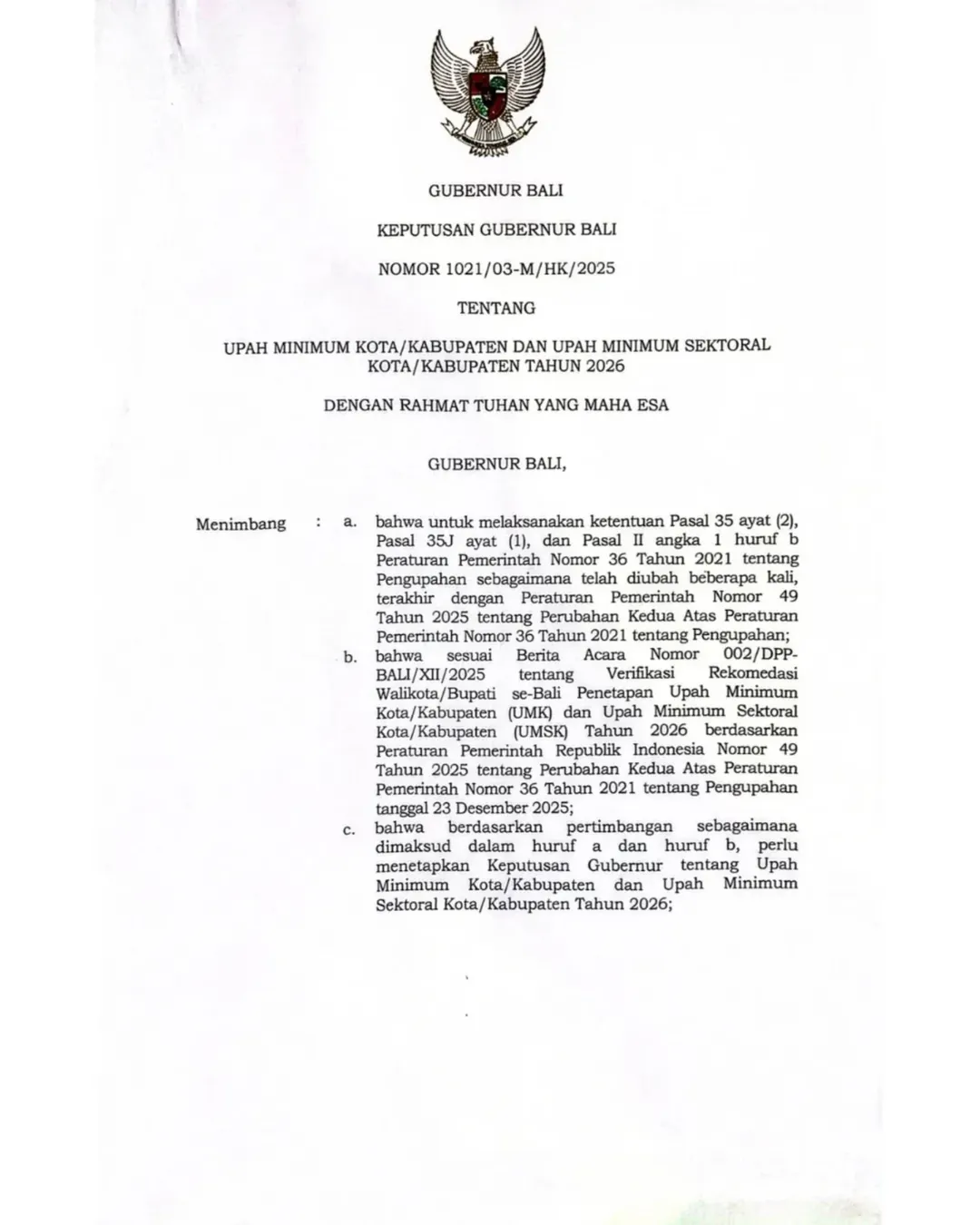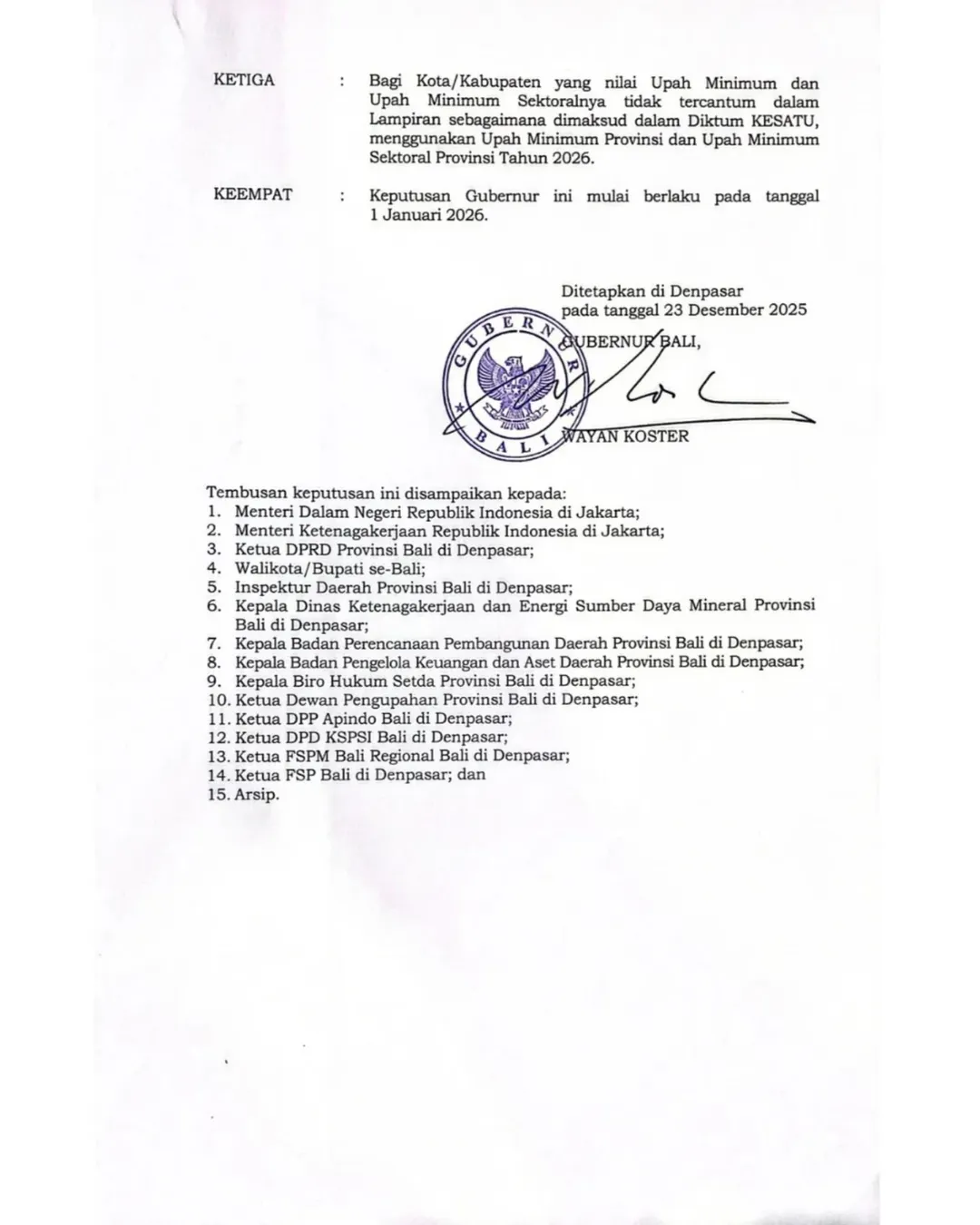 Dalam surat tersebut hanya ada empat kabupaten yang mengusulkan besaran UMK 2026 yakni Badung, Denpasar, Gianyar, dan Tabanan.