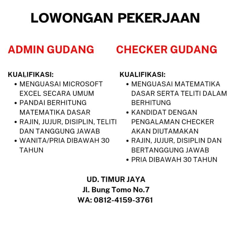 Judul: Lowongan Kerja Bali UD. Timur Jaya Denpasar Cari Admin dan Checker Gudang