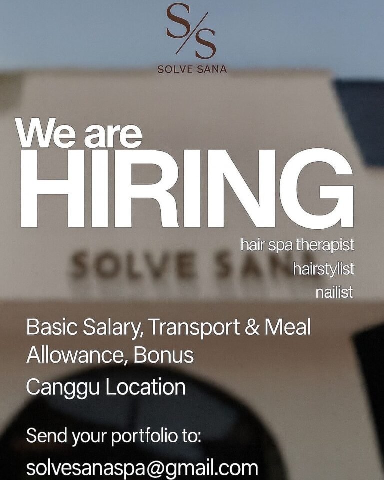 LOKER.BALINEWS.ID, BADUNG – Solve Sana membuka lowongan kerja Bali untuk posisi Hair Spa Therapist, Hairstylist, dan Nailist. Tersedia gaji pokok, tunjangan transport & makan, serta bonus. Penempatan kerja di wilayah Canggu. Kandidat diminta mengirimkan CV atau portofolio melalui email yang tertera.