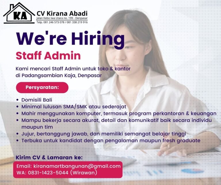 CV Kirana Abadi is looking for a new Staff Admin for our store and office in Padangsambian Kaja, Denpasar! 🇮🇩
