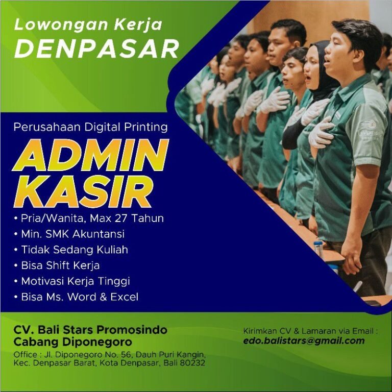 CV. Bali Stars Promosindo Cabang Diponegoro membuka lowongan kerja untuk posisi Admin Kasir bagi kamu yang energik, teliti, dan memiliki motivasi kerja tinggi!