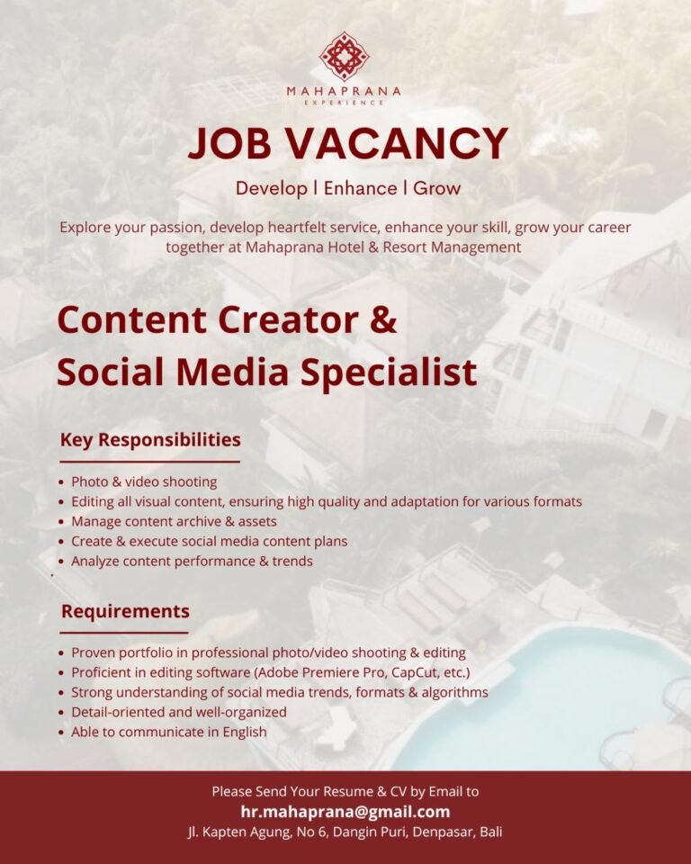 LOKER.BALINEWS.ID, DENPASAR — Mahaprana Hotel & Resort Management membuka peluang bagi kandidat kreatif dan berpengalaman untuk bergabung sebagai Content Creator & Social Media Specialist.