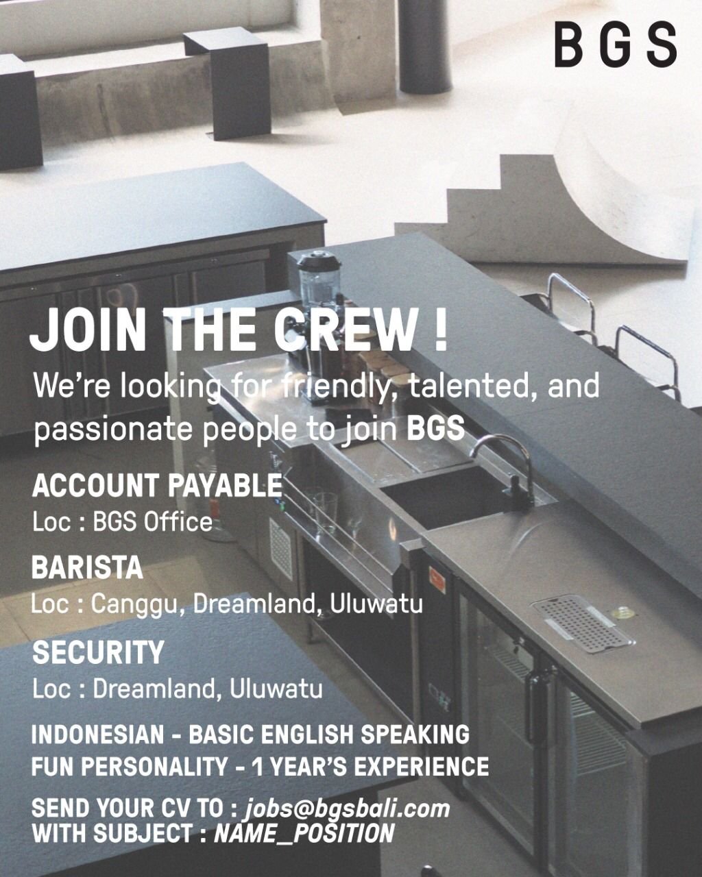 LOKER.BALINEWS.ID, BADUNG – BGS membuka lowongan kerja Bali terbaru untuk beberapa posisi, yaitu Account Payable dengan penempatan di BGS Office, Barista untuk area Canggu, Dreamland, dan Uluwatu, serta Security dengan penempatan di Dreamland dan Uluwatu. Kesempatan ini terbuka bagi kandidat yang ramah, bertanggung jawab, dan memiliki semangat kerja tinggi.