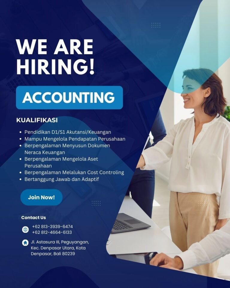 LOKER.BALINEWS.ID, DENPASAR – Sebuah perusahaan yang berlokasi di wilayah Denpasar Utara, Bali membuka lowongan kerja Bali untuk posisi Accounting. Lowongan ini ditujukan bagi kandidat dengan latar belakang pendidikan D1 atau S1 Akuntansi/Keuangan yang memiliki kemampuan mengelola pendapatan perusahaan serta berpengalaman dalam penyusunan dokumen neraca keuangan. Kandidat juga diharapkan memiliki pengalaman dalam pengelolaan aset perusahaan dan pelaksanaan cost controlling secara akurat. Perusahaan mencari individu yang bertanggung jawab, adaptif, serta mampu bekerja secara profesional dalam mendukung operasional dan pengelolaan keuangan perusahaan.