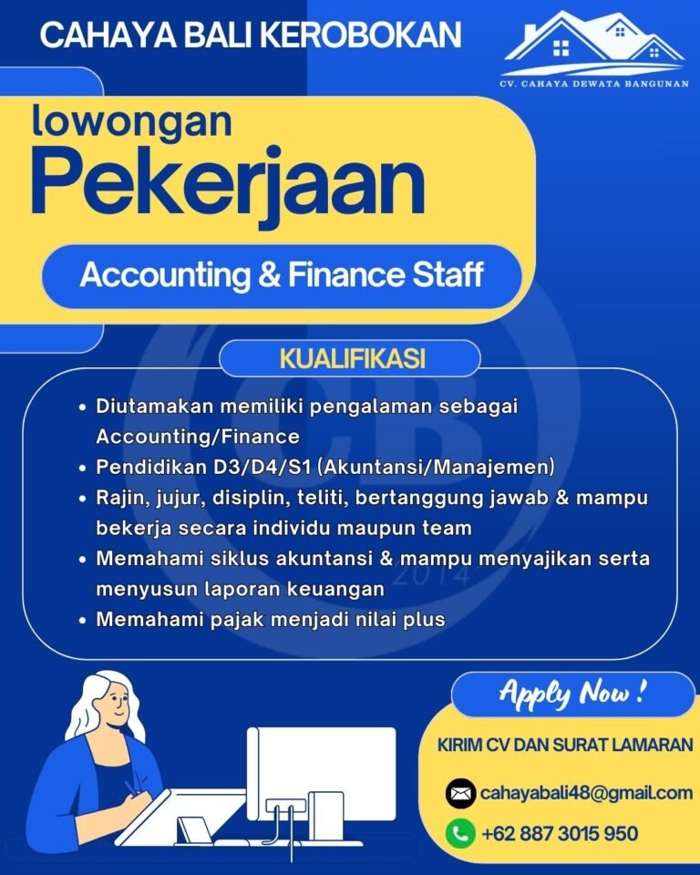 LOKER.BALINEWS.ID, BADUNG – CV. Cahaya Dewata Bangunan, yang dikenal melalui unit usahanya Cahaya Bali Kerobokan, saat ini tengah membuka kesempatan berkarir bagi para profesional muda untuk mengisi posisi strategis sebagai Accounting & Finance Staff. Perusahaan mencari kandidat yang memiliki latar belakang pendidikan minimal D3/D4/S1 di jurusan Akuntansi atau Manajemen. Fokus utama dari peran ini adalah mengelola siklus akuntansi perusahaan serta memiliki kemampuan teknis dalam menyajikan dan menyusun laporan keuangan secara akurat.