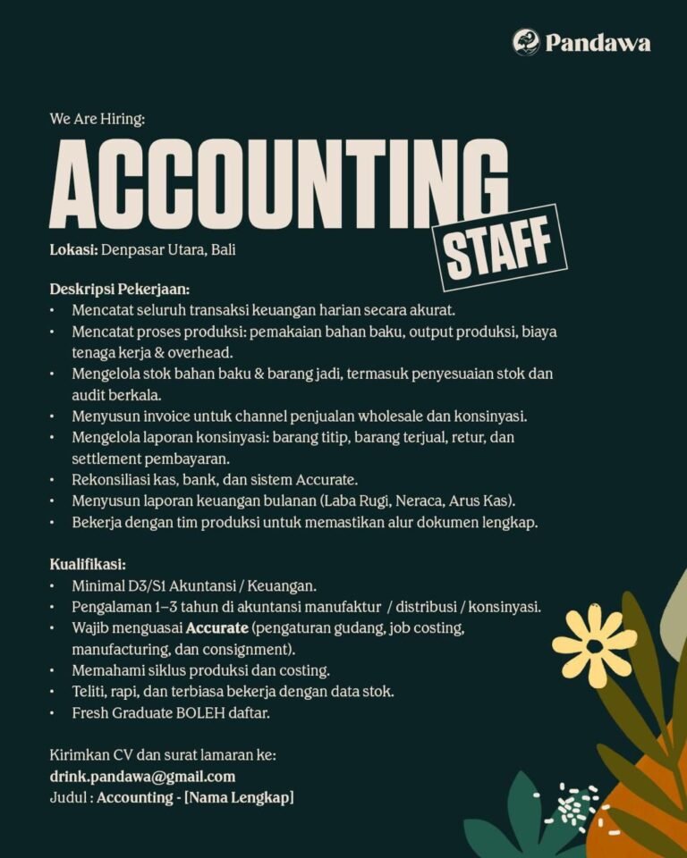Adapun kualifikasi yang dibutuhkan pada lowongan kerja Bali Accounting Staff ini antara lain menguasai software Accurate (gudang, job costing, manufacturing, dan consignment), memahami siklus produksi dan costing, teliti, rapi, serta terbiasa bekerja dengan data stok. Pengalaman kerja 1–3 tahun di bidang akuntansi manufaktur, distribusi, atau konsinyasi menjadi nilai tambah.