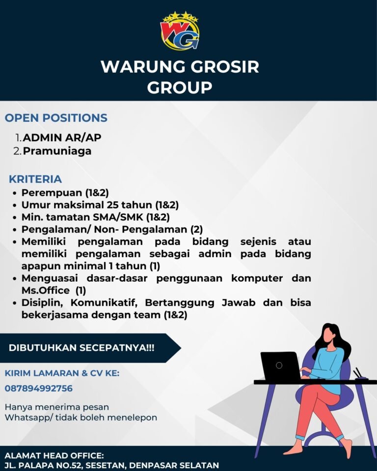 LOKER.BALINEWS.ID, DENPASAR — Warung Grosir Group membuka lowongan kerja untuk posisi Admin AR/AP dan Pramuniaga dengan penempatan di Denpasar Selatan.