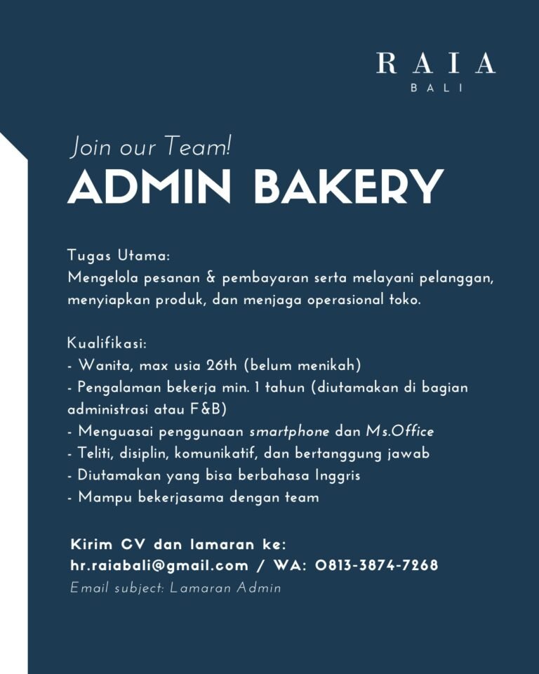 LOKER.BALINEWS.ID, DENPASAR — Raia Bali saat ini membuka Lowongan Kerja Bali Admin Bakery bagi kandidat perempuan yang teliti dan memiliki pengalaman di bidang administrasi atau F&B. Posisi ini bertanggung jawab dalam pengelolaan pesanan, pembayaran, pelayanan pelanggan, persiapan produk, serta menjaga kelancaran operasional toko secara keseluruhan. Perusahaan mencari kandidat yang mampu bekerja rapi, disiplin, dan komunikatif.