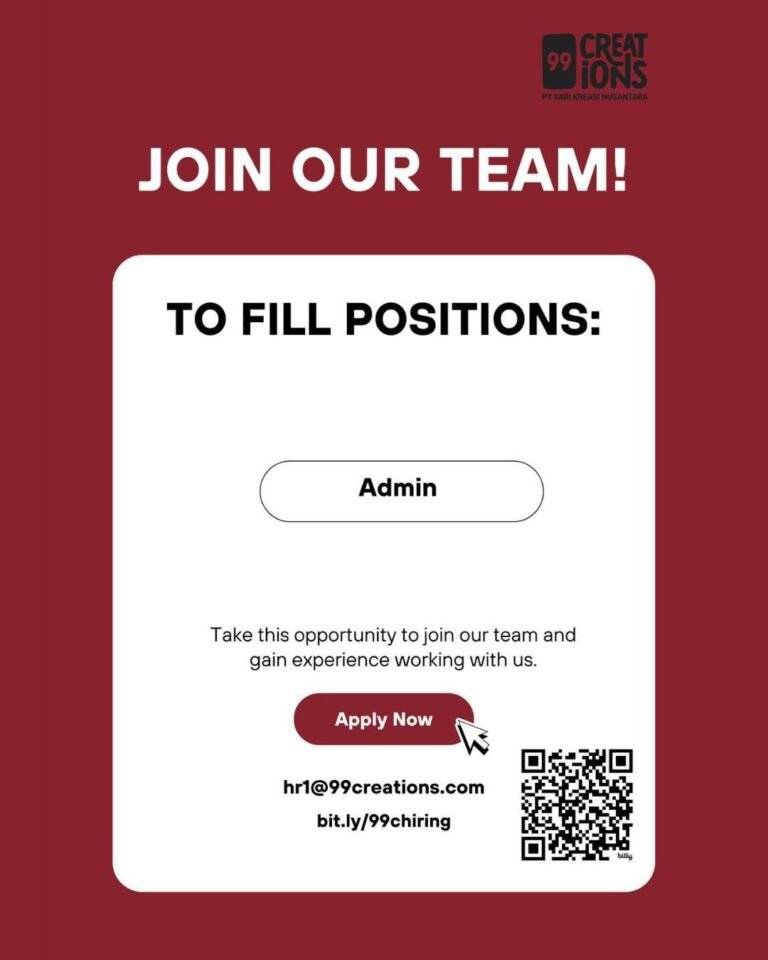 Proses pendaftaran dilakukan secara daring untuk memudahkan para pencari kerja. Kandidat yang berminat dapat langsung mengirimkan surat lamaran dan berkas pendukung ke alamat email resmi hr1@99creations.com atau mendaftarkan diri melalui tautan aplikasi di bit.ly/99chiring. Pastikan seluruh data yang dikirimkan sudah lengkap dan sesuai dengan kualifikasi yang dibutuhkan.