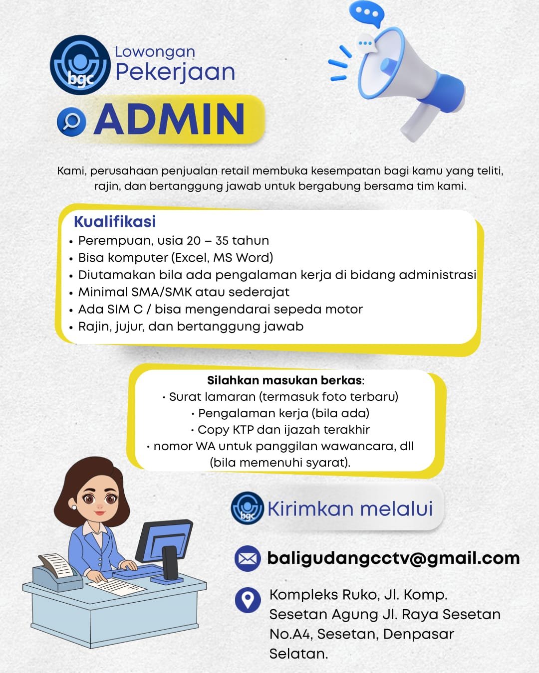 LOKER.BALINEWS.ID, DENPASAR SELATAN – Bali Gudang CCTV membuka lowongan kerja Bali terbaru untuk posisi Admin. Dibutuhkan kandidat perempuan usia 20–35 tahun, minimal lulusan SMA/SMK sederajat, mampu mengoperasikan komputer (Excel dan MS Word), memiliki SIM C atau bisa mengendarai sepeda motor, serta rajin, jujur, dan bertanggung jawab. Pengalaman di bidang administrasi menjadi nilai tambah. Penempatan kerja berlokasi di Sesetan, Denpasar Selatan.
