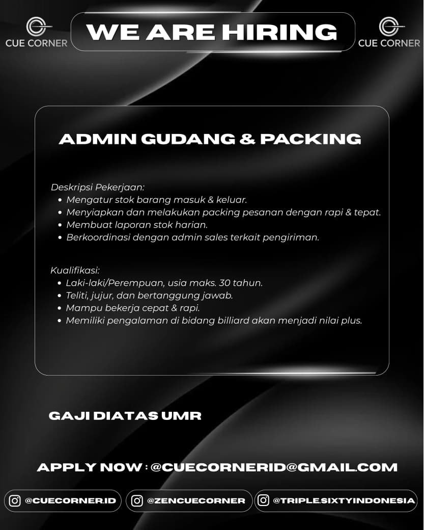 LOKER.BALINEWS.ID, BALI — Cue Corner membuka Lowongan Kerja Bali Admin Gudang dan Packing di Cue Corner bagi kandidat yang siap bekerja dengan sistem administrasi stok dan pengemasan secara rapi dan tepat waktu.