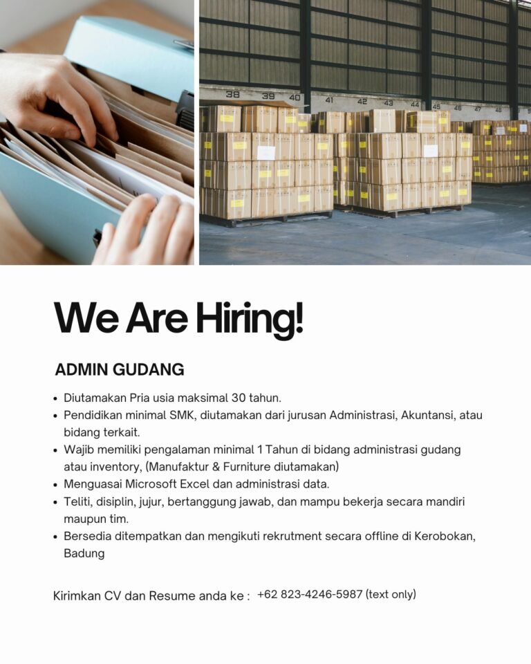 Posisi Admin Gudang bertanggung jawab dalam pengelolaan data barang masuk dan keluar, pencatatan inventory, serta administrasi gudang menggunakan Microsoft Excel. Kandidat diharapkan memiliki ketelitian tinggi, disiplin, jujur, dan mampu bekerja secara mandiri maupun dalam tim. Latar belakang pendidikan minimal SMK, diutamakan jurusan Administrasi, Akuntansi, atau bidang terkait.