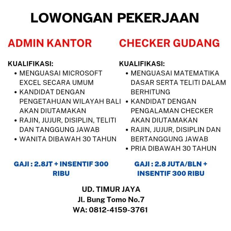 LOKER.BALINEWS.ID, DENPASAR – UD. Timur Jaya saat ini membuka lowongan kerja terbaru untuk posisi Admin Kantor dan Checker Gudang yang akan ditempatkan di wilayah Denpasar, Bali. Kesempatan ini terbuka bagi kandidat yang teliti, disiplin, dan siap bekerja secara profesional sesuai bidang masing-masing.