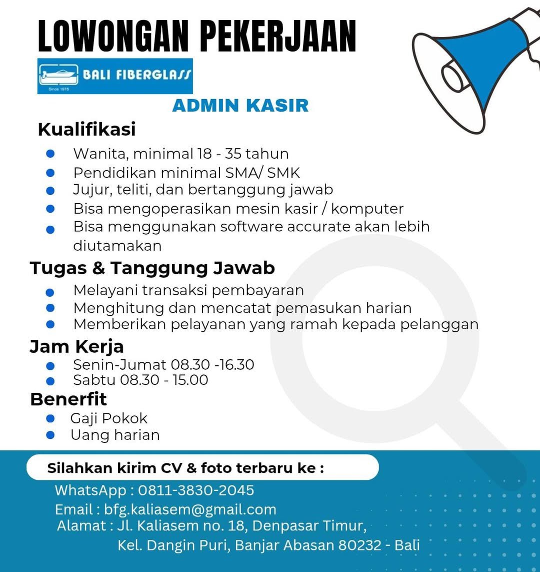 BALI FIBERGLASS membuka kesempatan kerja untuk posisi Admin Kasir dan Helper. Kandidat diutamakan jujur, teliti, bertanggung jawab, mampu bekerja dalam tim, serta siap mengikuti jam kerja operasional. Tersedia gaji pokok dan uang harian. Kirimkan CV & foto terbaru melalui WhatsApp 0811-3830-2045 atau email ke bfg.kaliasem@gmail.com. Lokasi kerja: Jl. Kaliasem No.18, Denpasar Timur, Bali.