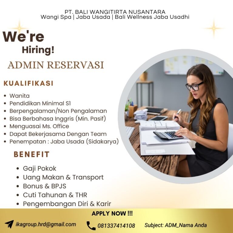 LOKER.BALINEWS.ID, DENPASAR — PT Bali Wangitirta Nusantara (Wangi Spa | Jaba Usada | Bali Wellness Jaba Usadhi) membuka lowongan Admin Reservasi untuk penempatan Jaba Usada (Sidakarya).