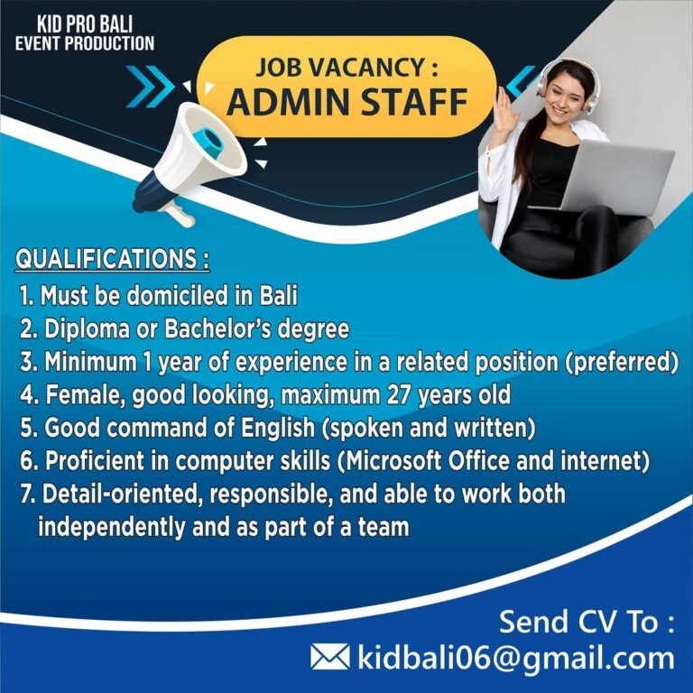 LOKER.BALINEWS.ID, BALI – Kid Pro Bali Event Production, salah satu perusahaan yang bergerak di bidang produksi acara (event production) di Bali, saat ini sedang membuka lowongan pekerjaan untuk posisi Admin Staff. Kesempatan karir ini terbuka bagi tenaga kerja lokal yang berdomisili di wilayah Bali. Posisi ini memegang peranan penting dalam mendukung kelancaran operasional administrasi di lingkungan kerja yang kreatif dan dinamis.