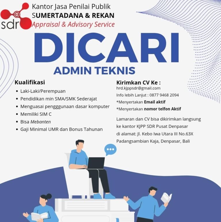 LOKER.BALINEWS.ID, DENPASAR – Kantor Jasa Penilai Publik (KJPP) Sumertadana & Rekan saat ini sedang membuka kesempatan berkarir bagi tenaga kerja profesional untuk mengisi posisi Admin Teknis. Penempatan kerja akan dipusatkan di kantor KJPP SDR Pusat Denpasar yang berlokasi di Jl. Kebo Iwa Utara III No. 63X, Padangsambian Kaja. Perusahaan menawarkan gaji minimal standar UMR serta bonus tahunan bagi kandidat yang terpilih.