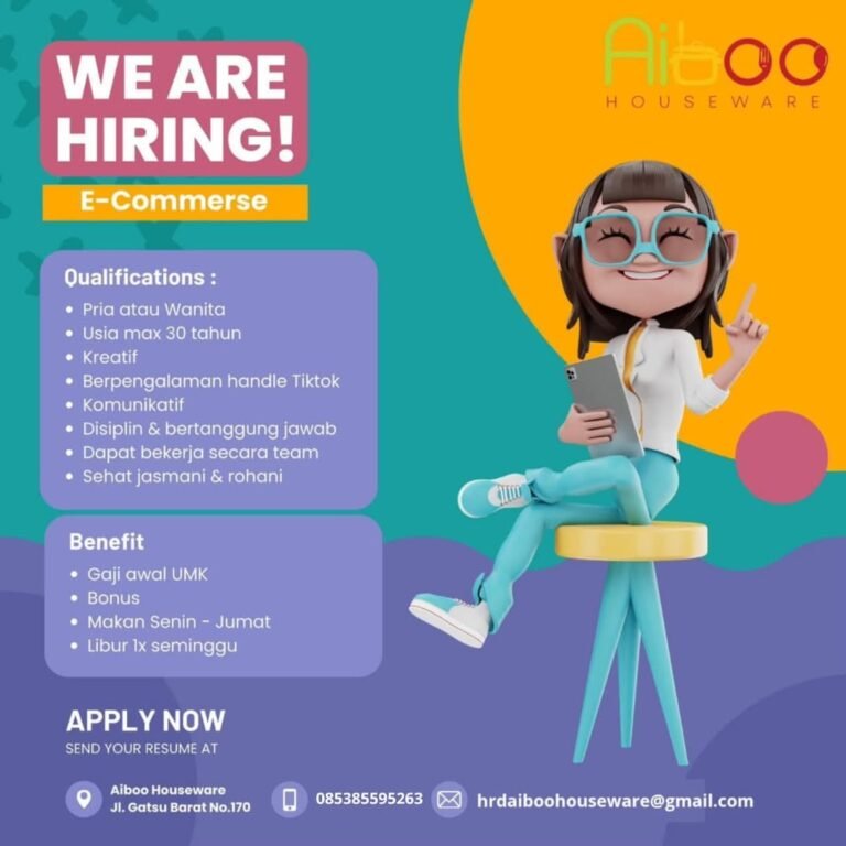 LOKER.BALINEWS.ID, DENPASAR – Aiboo Houseware, perusahaan ritel perlengkapan rumah tangga yang sedang berkembang, kembali membuka kesempatan karir bagi talenta muda di Bali untuk posisi E-Commerce. Lowongan ini ditujukan bagi pria maupun wanita dengan usia maksimal 30 tahun yang memiliki jiwa kreatif serta melek teknologi. Kandidat terpilih nantinya akan bertanggung jawab dalam mengelola toko daring perusahaan, termasuk memiliki pengalaman dalam menangani konten dan operasional di platform TikTok.