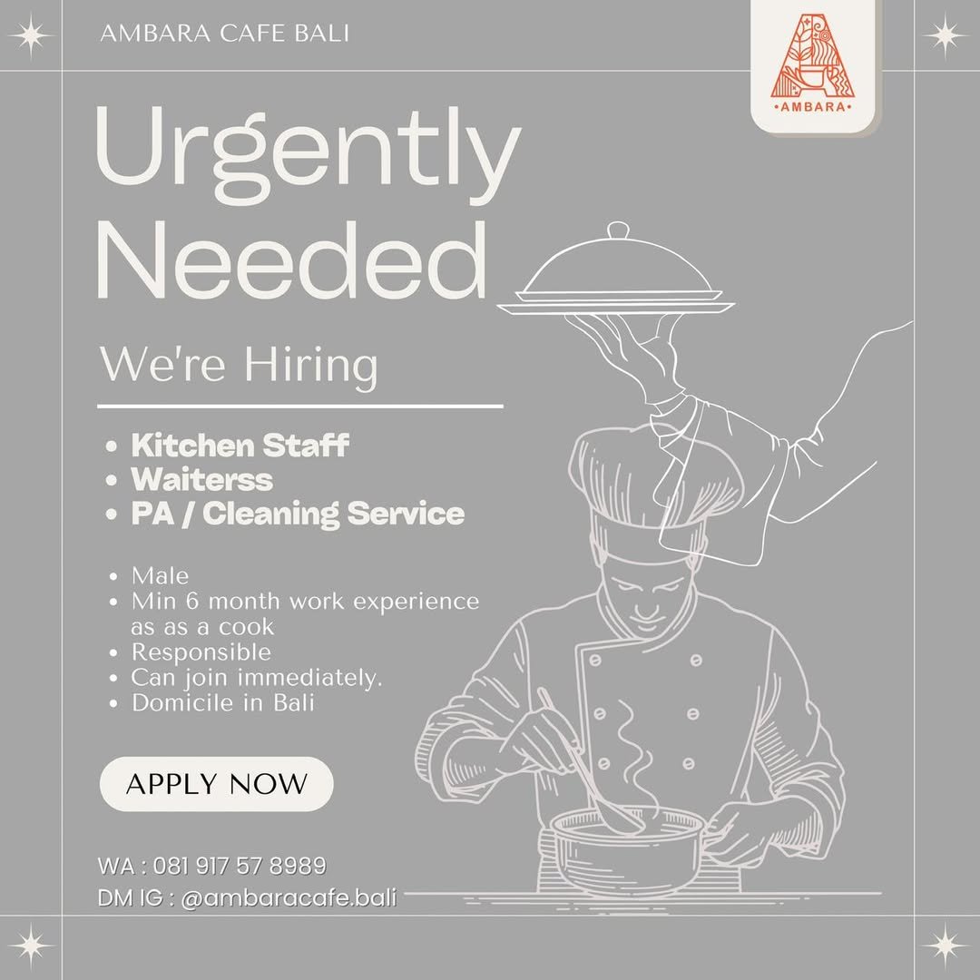 LOKER.BALINEWS.ID, BALI – Industri kuliner di Pulau Dewata kembali menunjukkan gairahnya dengan dibukanya kesempatan berkarir di Ambara Cafe Bali. Mengusung tema “Urgently Needed”, kafe ini tengah mencari kandidat-kandidat potensial untuk mengisi posisi strategis guna memperkuat tim operasional mereka. Adapun posisi yang sedang dibutuhkan saat ini meliputi Kitchen Staff, Waiter/Waitress, serta Public Area (PA) atau Cleaning Service.