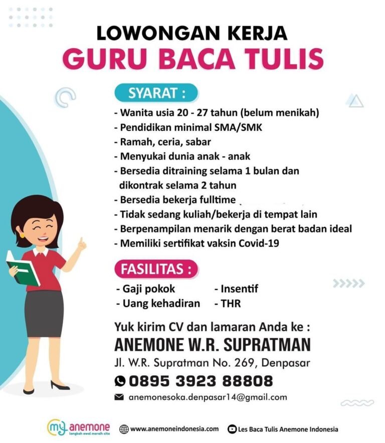 LOKER.BALINEWS.ID, DENPASAR – Lembaga bimbingan belajar baca tulis ternama, Anemone W.R. Supratman, saat ini sedang membuka kesempatan berkarir bagi tenaga pendidik berbakat untuk menempati posisi Guru Baca Tulis. Lowongan ini dikhususkan bagi wanita dengan kriteria usia antara 20 hingga 27 tahun dan belum menikah. Pelamar yang memiliki latar belakang pendidikan minimal SMA/SMK serta memiliki kepribadian yang ramah, ceria, sabar, dan sangat menyukai dunia anak-anak sangat diharapkan untuk bergabung.
