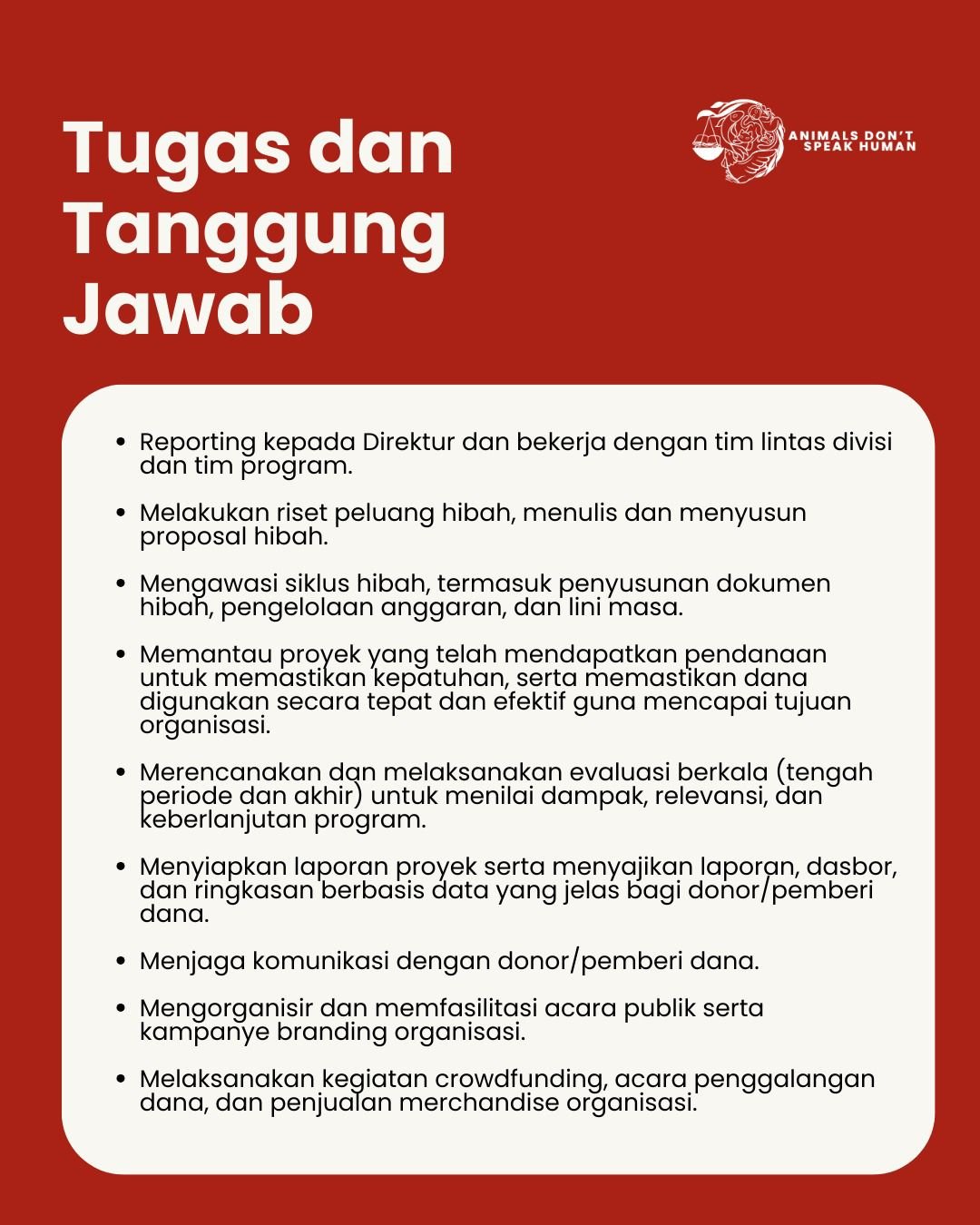 LOKER.BALINEWS.ID, TABANAN – Organisasi nirlaba yang bergerak di bidang kesejahteraan hewan, Animals Don’t Speak Human, saat ini sedang membuka kesempatan karier bagi para profesional untuk mengisi posisi sebagai Grant Officer. Posisi ini menawarkan sistem kerja hibrida (hybrid working) dengan basis operasional di wilayah Tabanan, Bali, untuk masa kontrak kerja selama satu tahun. Kandidat yang terpilih nantinya akan bertanggung jawab penuh waktu selama 5 hari kerja dalam sepekan untuk mendukung program-program perlindungan hewan di balik layar.