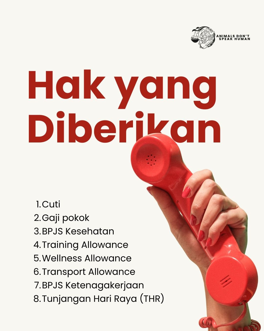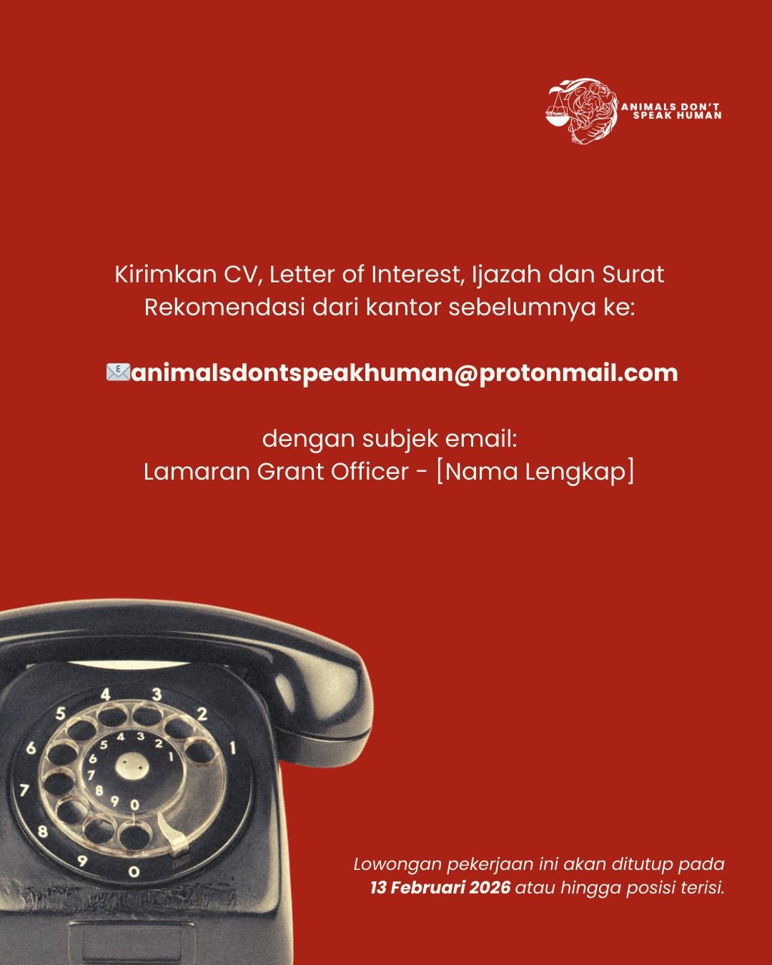 Pihak organisasi memberikan berbagai hak dan fasilitas menarik bagi staf yang bergabung, mulai dari gaji pokok, tunjangan hari raya (THR), hingga perlindungan BPJS Kesehatan dan Ketenagakerjaan. Selain itu, tersedia pula tunjangan transportasi, tunjangan pelatihan (training allowance), serta tunjangan kesehatan mental (wellness allowance). Bagi Anda yang memiliki kepedulian terhadap isu perlindungan hewan, segera kirimkan CV, surat ketertarikan, ijazah, dan surat rekomendasi ke email animalsdontspeakhuman@protonmail.com paling lambat hingga 13 Februari 2026.