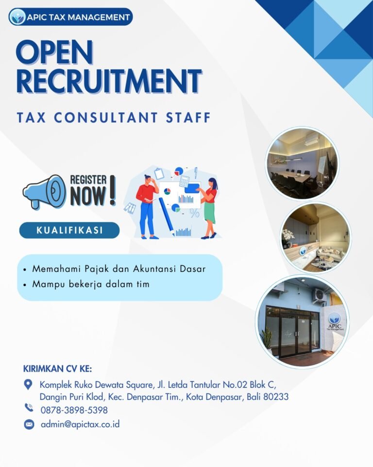 LOKER.BALINEWS.ID, DENPASAR — APIC Tax Management membuka kesempatan bagi kandidat yang ingin berkarier di bidang perpajakan sebagai Tax Consultant Staff. Posisi ini cocok bagi pelamar yang memahami pajak dan akuntansi dasar serta mampu bekerja dalam tim.