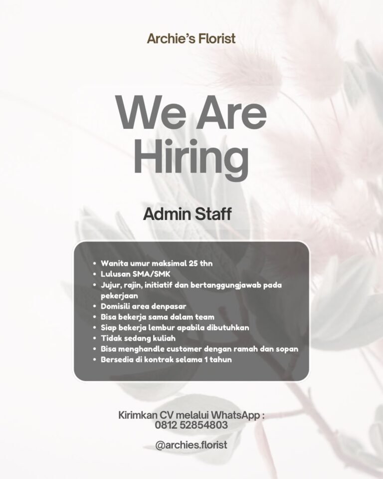 LOKER.BALINEWS.ID, DENPASAR – Archie’s Florist, unit usaha yang bergerak di bidang perangkaian bunga dan hadiah, saat ini sedang membuka kesempatan berkarir bagi individu yang ramah dan cekatan untuk mengisi posisi Admin Staff. Lowongan ini ditujukan bagi talenta lokal yang berdomisili di area Denpasar dan sekitarnya untuk bergabung dalam tim operasional toko.
