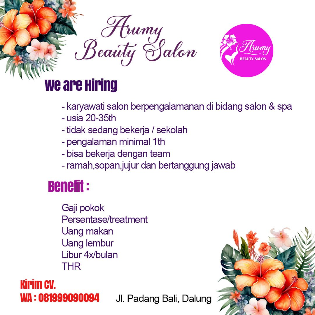 Salon menyediakan sejumlah benefit menarik, di antaranya gaji pokok, persentase per treatment, uang makan, uang lembur, libur empat kali dalam sebulan, serta THR. Pelamar yang berminat dapat mengirimkan CV melalui WhatsApp ke 0819-9909-0094. Penempatan kerja berlokasi di Jalan Padang Bali, Dalung.