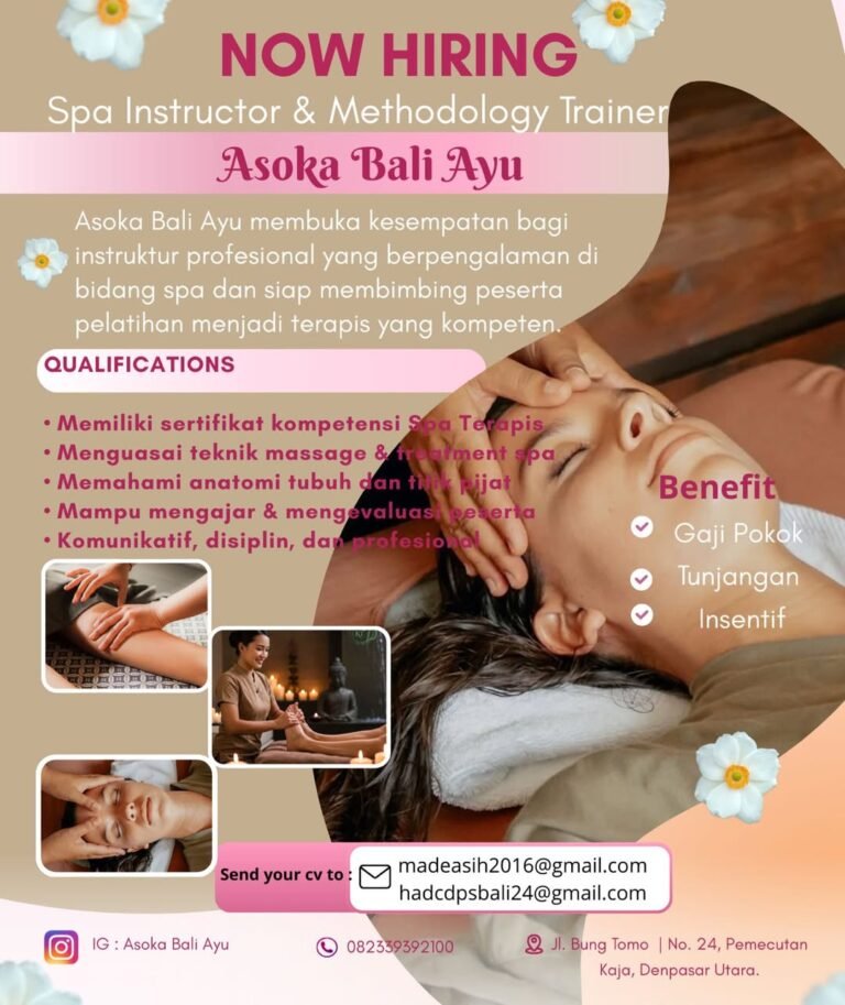 LOKER.BALINEWS.ID, DENPASAR – Asoka Bali Ayu, lembaga pelatihan dan layanan kesehatan serta kecantikan terkemuka di Denpasar, saat ini membuka kesempatan bagi para instruktur profesional untuk bergabung sebagai Spa Instructor & Methodology Trainer. Lowongan ini ditujukan bagi individu yang memiliki pengalaman mendalam di bidang spa dan siap untuk membimbing serta mencetak calon terapis menjadi tenaga kerja yang kompeten. Kandidat diwajibkan memiliki sertifikat kompetensi Spa Terapis, menguasai berbagai teknik pijat (massage) dan perawatan spa, serta memahami anatomi tubuh dan titik pijat secara mendetail.