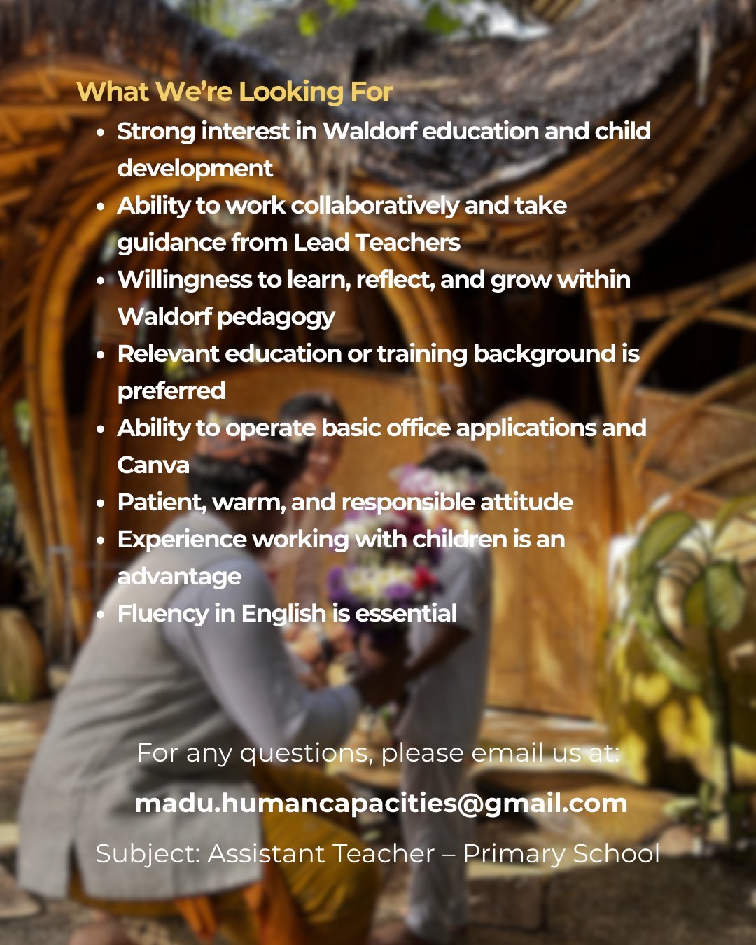 LOKER.BALINEWS.ID, KABUPATEN GIANYAR — Saat ini sebuah sekolah berbasis pendidikan Waldorf yang berlokasi di wilayah Ubud membuka Lowongan Kerja Bali Assistant Teacher Primary School. Posisi ini ditujukan bagi kandidat yang memiliki ketertarikan pada dunia pendidikan anak, mampu bekerja kolaboratif, serta siap berkembang dalam lingkungan belajar yang penuh empati dan ritme pembelajaran yang terstruktur. Sekolah mencari individu yang teliti, bertanggung jawab, ramah, serta memiliki kemampuan komunikasi yang baik.