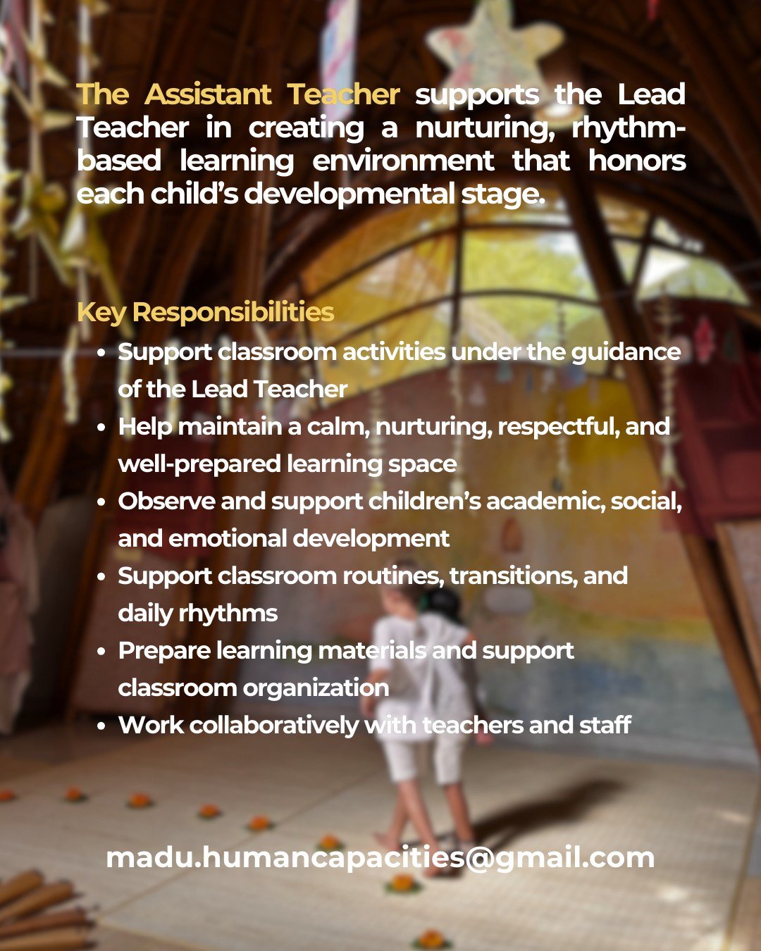 LOKER.BALINEWS.ID, KABUPATEN GIANYAR — Saat ini sebuah sekolah berbasis pendidikan Waldorf yang berlokasi di wilayah Ubud membuka Lowongan Kerja Bali Assistant Teacher Primary School. Posisi ini ditujukan bagi kandidat yang memiliki ketertarikan pada dunia pendidikan anak, mampu bekerja kolaboratif, serta siap berkembang dalam lingkungan belajar yang penuh empati dan ritme pembelajaran yang terstruktur. Sekolah mencari individu yang teliti, bertanggung jawab, ramah, serta memiliki kemampuan komunikasi yang baik.