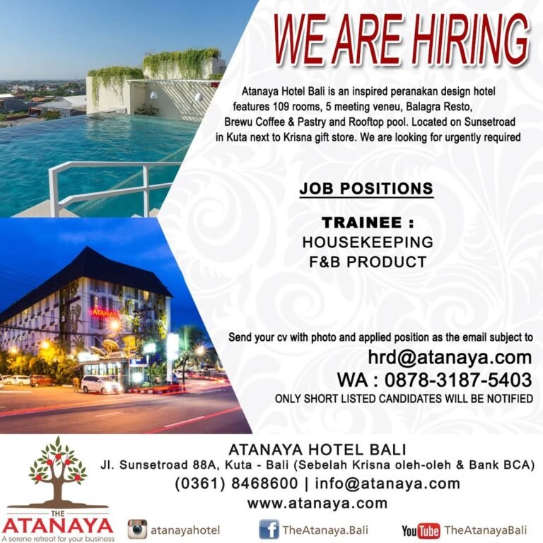 LOKER.BALINEWS.ID, BADUNG – Atanaya Hotel Bali, sebuah hotel dengan desain peranakan yang berlokasi strategis di kawasan Kuta, saat ini sedang membuka kesempatan bagi para talenta muda untuk bergabung melalui program Trainee. Hotel yang memiliki fasilitas 109 kamar, kolam renang atap (rooftop pool), serta berbagai gerai makanan seperti Balagra Resto dan Brewu Coffee & Pastry ini sedang mencari individu yang bersemangat untuk belajar dan berkembang di industri perhotelan. Posisi pelatihan yang tersedia difokuskan pada departemen Housekeeping dan F&B Product guna mendukung operasional harian hotel.