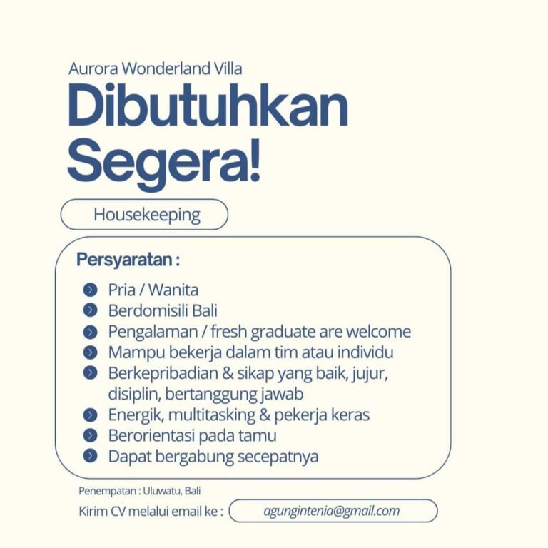 LOKER.BALINEWS.ID, BADUNG – Aurora Wonderland Villa, sebuah penginapan eksklusif yang berlokasi di kawasan pariwisata Uluwatu, saat ini tengah membuka kesempatan karir bagi individu yang berdedikasi untuk mengisi posisi Housekeeping. Perusahaan mencari kandidat, baik pria maupun wanita, yang berdomisili di Bali dan memiliki semangat kerja yang tinggi untuk menjaga standar kebersihan serta kenyamanan tamu. Posisi ini terbuka bagi mereka yang sudah berpengalaman di bidangnya maupun bagi lulusan baru (fresh graduate) yang ingin memulai karir di industri perhotelan.