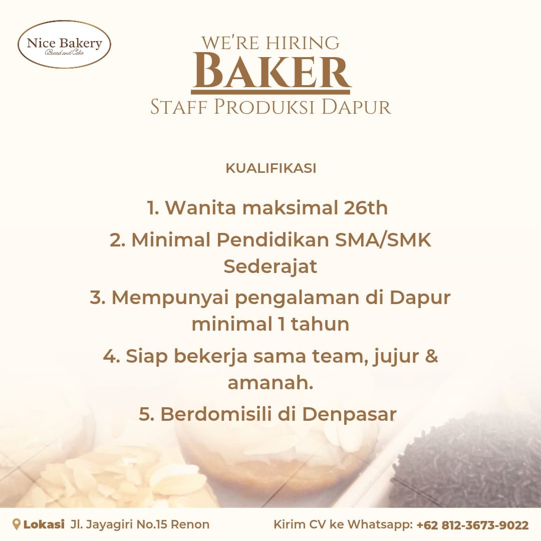 LOKER.BALINEWS.ID, DENPASAR – Nice Bakery saat ini membuka lowongan kerja Bali untuk posisi Baker (Staff Produksi Dapur) yang akan ditempatkan di wilayah Renon, Denpasar. Lowongan ini dibuka khusus untuk kandidat wanita dengan usia maksimal 26 tahun dan memiliki minat serta pengalaman di bidang dapur atau bakery.