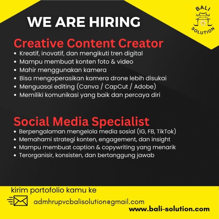 LOKER.BALINEWS.ID, DENPASAR — Bali Solution membuka peluang karier bagi talenta kreatif di bidang digital melalui dua posisi sekaligus, yaitu Creative Content Creator dan Social Media Specialist. Untuk posisi Creative Content Creator, perusahaan mencari kandidat yang kreatif, inovatif, serta mengikuti tren digital. Pelamar diharapkan mampu membuat konten foto dan video, mahir menggunakan kamera, lebih disukai yang bisa mengoperasikan drone, serta menguasai software editing seperti Canva, CapCut, atau Adobe. Kemampuan komunikasi yang baik dan percaya diri juga menjadi nilai penting.