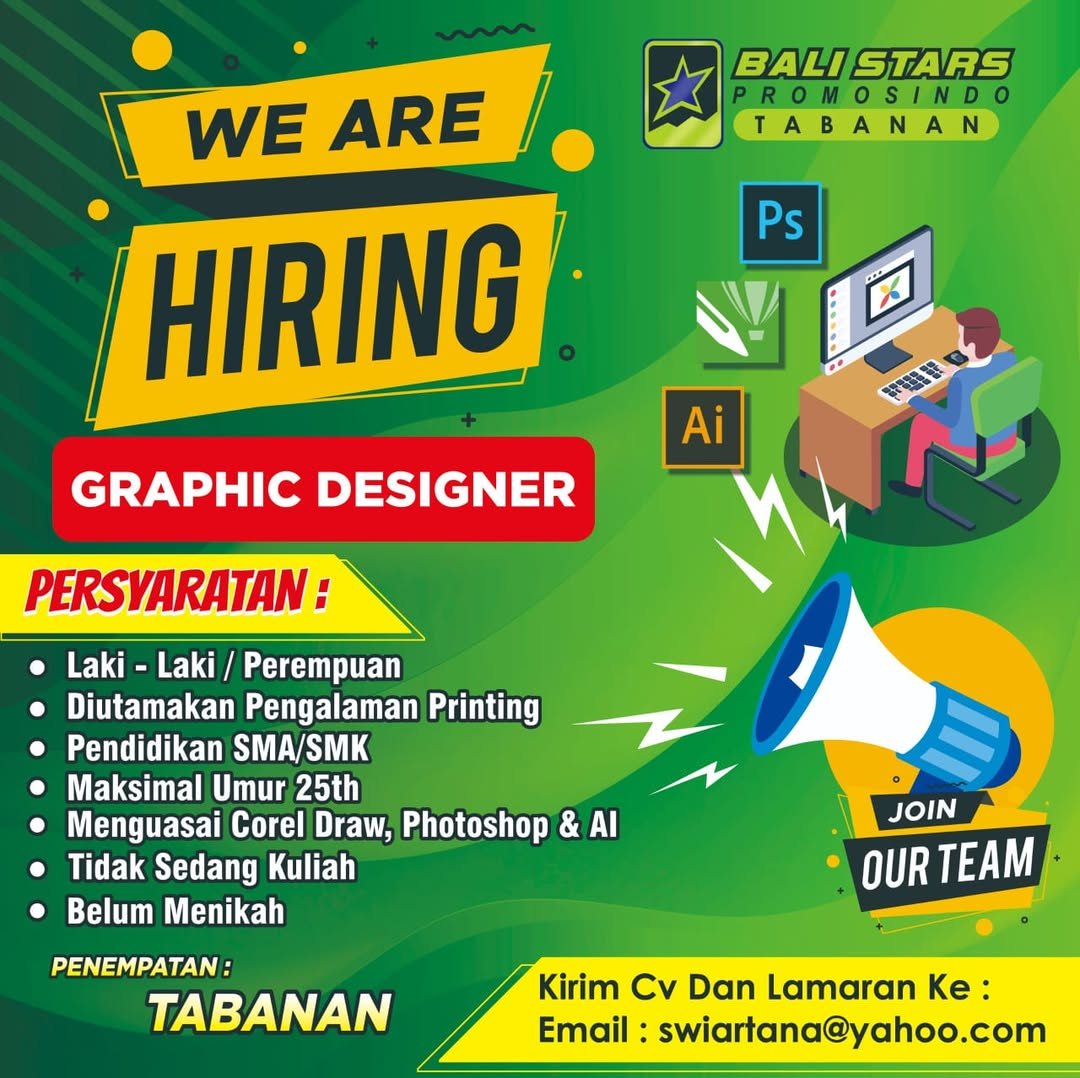 LOKER.BALINEWS.ID, TABANAN – Perusahaan periklanan Bali Stars Promosindo yang berbasis di Tabanan saat ini sedang membuka kesempatan karier bagi talenta kreatif untuk bergabung sebagai Graphic Designer. Perusahaan mencari individu yang memiliki gairah tinggi dalam dunia desain visual untuk memperkuat tim kreatif mereka dalam menghasilkan karya-karya berkualitas bagi klien. Penempatan posisi ini akan difokuskan di wilayah Kabupaten Tabanan.