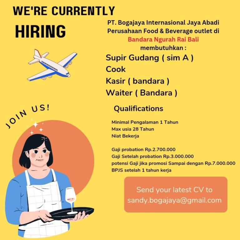 Posisi yang dibuka antara lain Supir Gudang dengan SIM A, Cook, Kasir Bandara, serta Waiter Bandara. Lowongan kerja Bali ini terbuka bagi pelamar dengan minimal pengalaman kerja satu tahun, usia maksimal 28 tahun, serta memiliki niat dan motivasi kerja yang tinggi.
