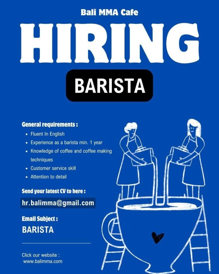 Dalam rekrutmen ini, kandidat yang terpilih akan bertanggung jawab memastikan kualitas rasa minuman konsisten, menjaga kebersihan area kerja, serta memberikan pengalaman terbaik bagi setiap pengunjung. Lowongan Kerja Bali Barista Bali MMA Cafe menjadi peluang menarik bagi mereka yang ingin berkembang di industri food & beverage sekaligus bekerja di lingkungan yang dinamis. Pelamar dapat mengirimkan CV terbaru melalui alamat email resmi yang tercantum pada pengumuman rekrutmen.