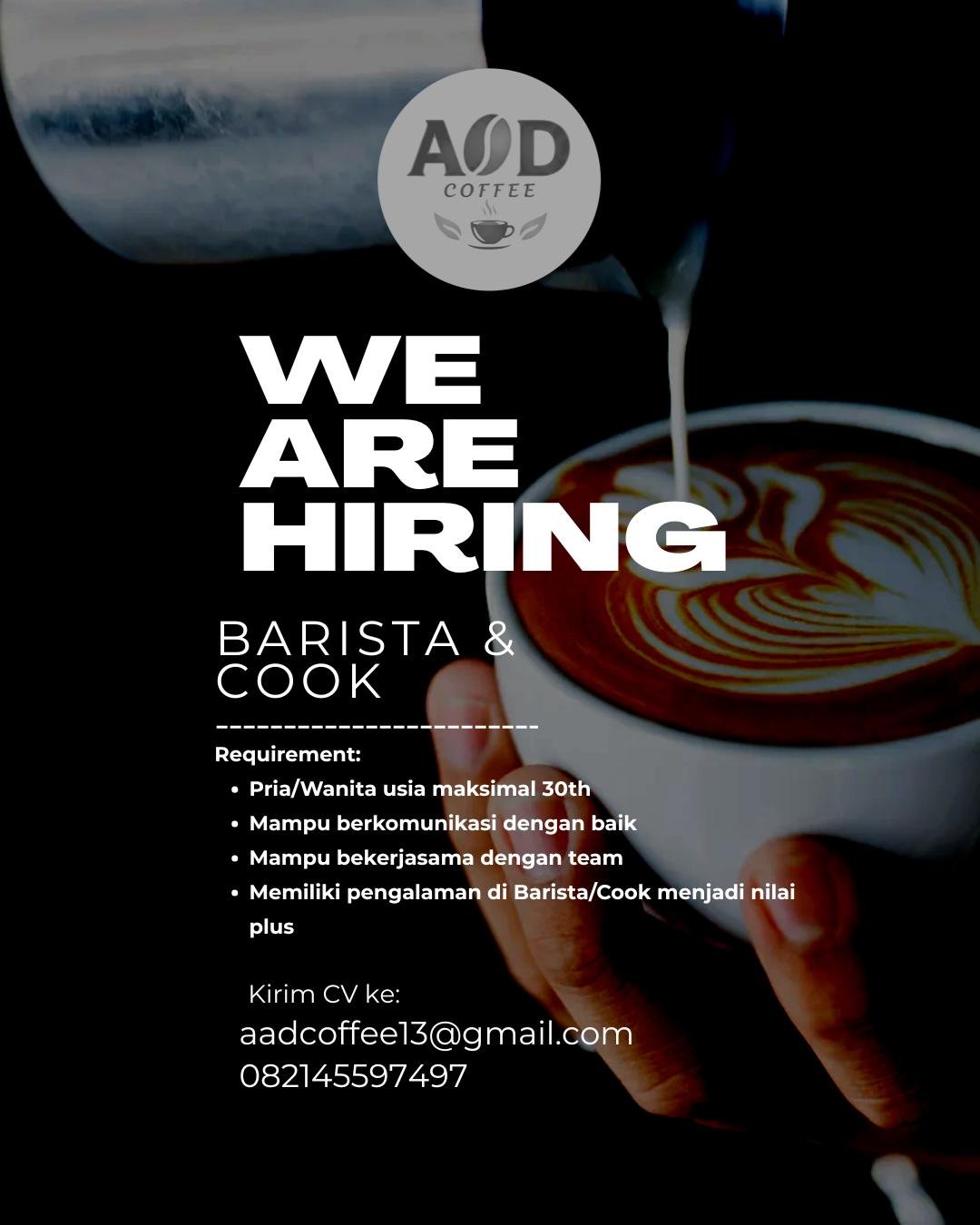 LOKER.BALINEWS.ID, GIANYAR – AAD Coffee membuka lowongan kerja Bali terbaru untuk posisi Barista dan Cook. Kesempatan ini terbuka bagi pria dan wanita usia maksimal 30 tahun yang mampu berkomunikasi dengan baik, dapat bekerja sama dalam tim, serta memiliki pengalaman di bidang barista atau cook menjadi nilai tambah. Segera kirimkan CV dan lamaran Anda.