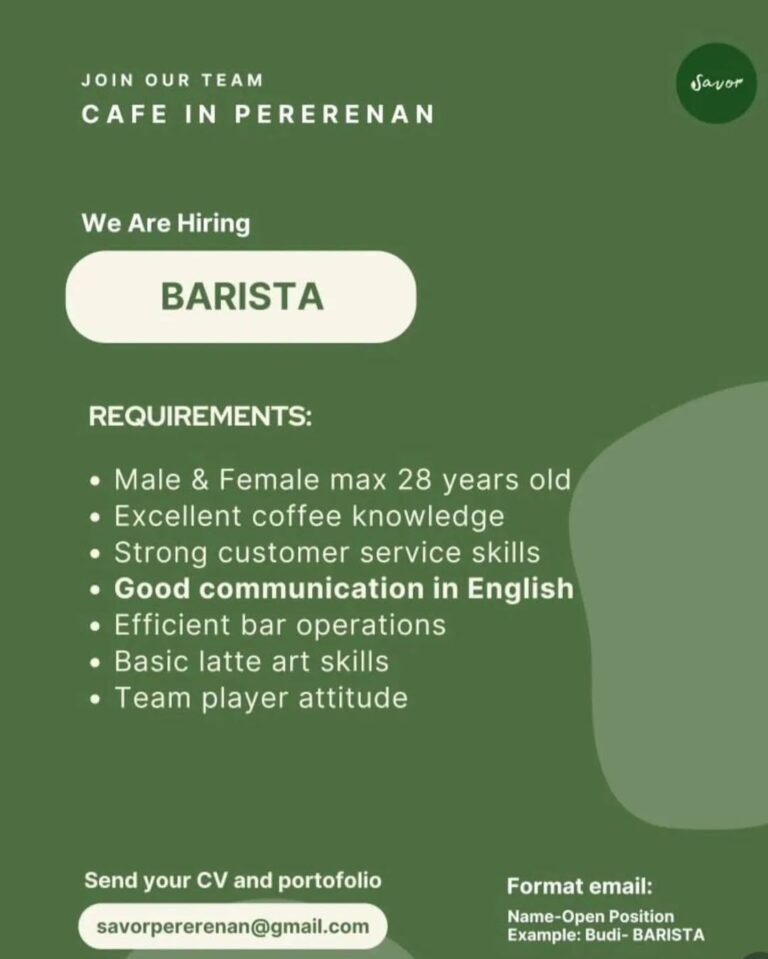 Bagi Anda yang memenuhi kriteria tersebut, segera kirimkan Curriculum Vitae (CV) dan portofolio terbaru Anda melalui email ke savorpererenan@gmail.com. Pastikan Anda menuliskan subjek email sesuai format yang diminta, yaitu: Nama – Posisi yang Dilamar (Contoh: Budi – BARISTA). Jangan lewatkan peluang untuk menjadi bagian dari tim Savor Cafe di salah satu titik paling tren di Bali saat ini.
