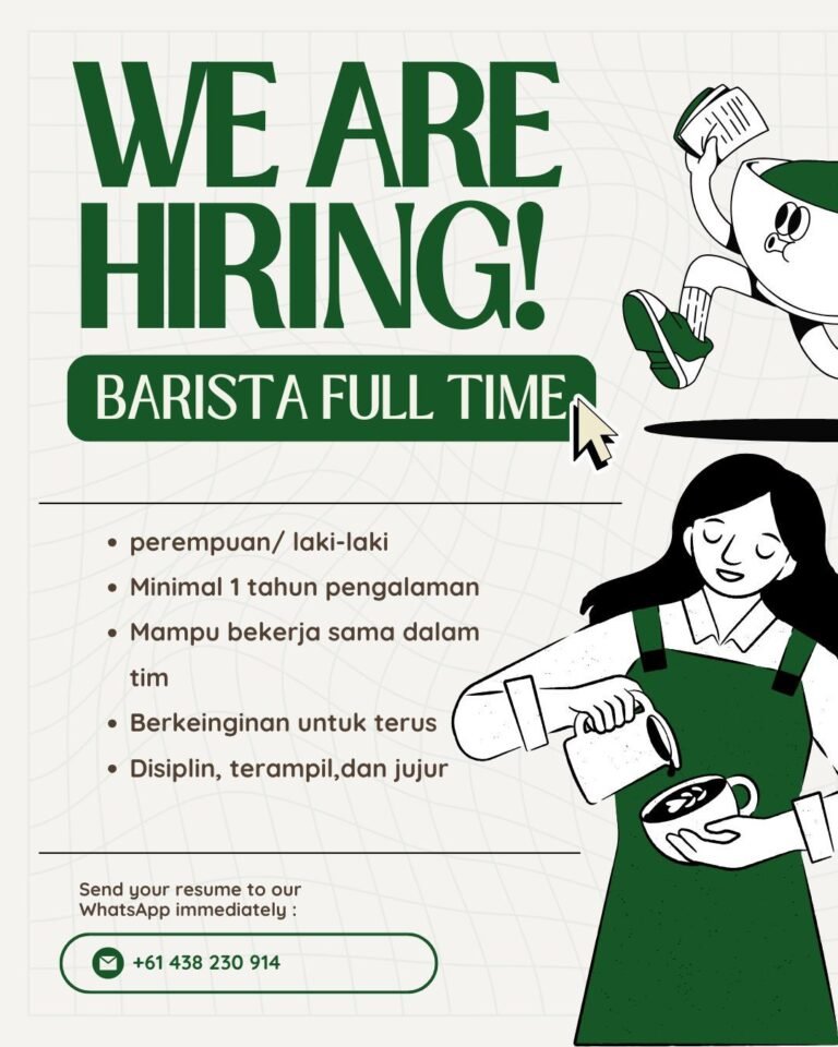 Bagi pencari lowongan kerja Bali Barista Full Time, segera kirimkan CV atau resume Anda melalui WhatsApp sesuai kontak yang tertera. Jangan lewatkan peluang bergabung dengan tim Semata Coffee dan kembangkan karier Anda di industri kopi Bali.