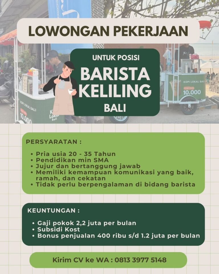 LOKER.BALINEWS.ID, DENPASAR — Perusahaan minuman kopi yang sedang berkembang membuka Lowongan Kerja Bali Barista Keliling Denpasar untuk kandidat berusia 20–35 tahun yang jujur, bertanggung jawab, serta memiliki komunikasi yang baik. Posisi ini tidak mensyaratkan pengalaman sebagai barista, sehingga menjadi peluang menarik bagi pencari kerja pemula yang ingin memulai karier di industri kopi. Dengan sistem kerja mobile, pelamar akan bertugas melayani pelanggan di sejumlah titik strategis di Denpasar dan sekitarnya.