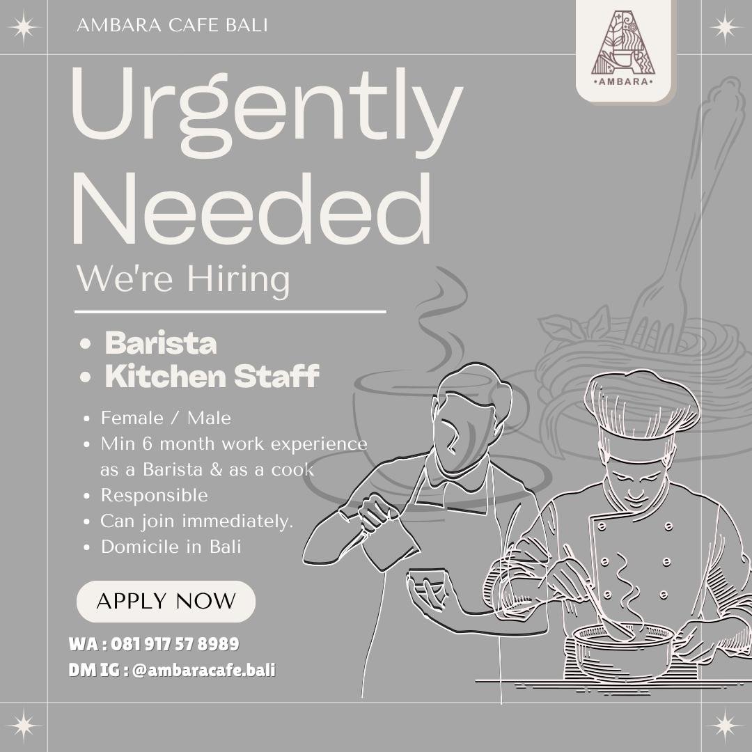 LOKER.BALINEWS.ID, DENPASAR – Ambaracafe Bali saat ini membuka lowongan kerja Bali untuk beberapa posisi yaitu Barista dan Kitchen Staff. Lowongan ini dibuka untuk pria maupun wanita yang berdomisili di Bali dan siap bergabung dalam waktu dekat.
