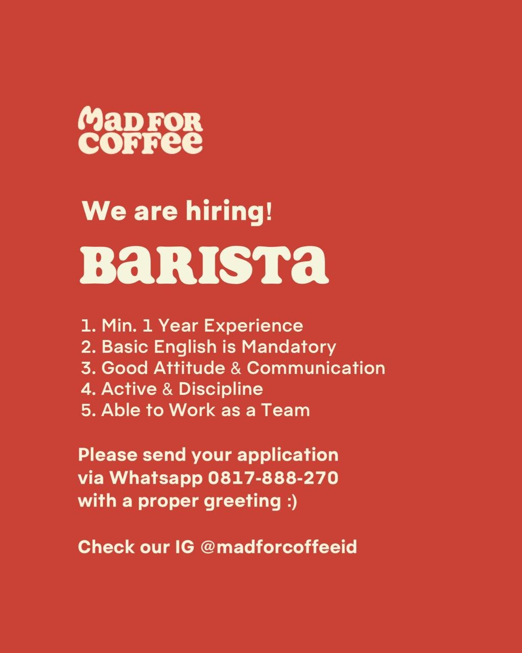Lamaran dapat dikirim melalui WhatsApp 0817-888-270 dengan sapaan yang sopan. Informasi lebih lanjut dapat dilihat melalui Instagram @madforcoffeeid.