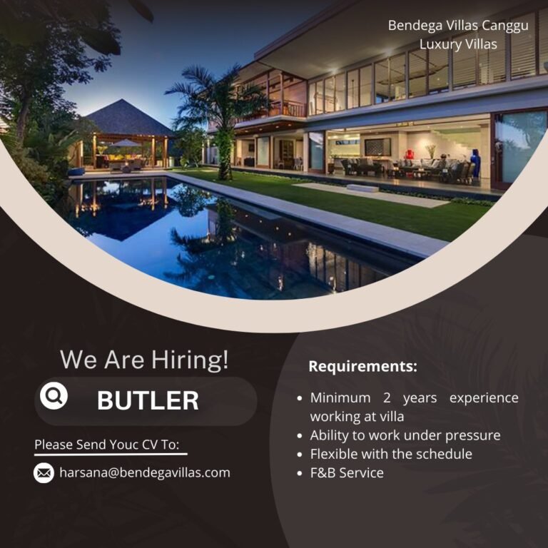 LOKER.BALINEWS.ID, BADUNG – Bendega Villas Canggu Luxury Villas, sebuah akomodasi mewah yang terletak di kawasan premium Canggu, saat ini sedang mencari tenaga profesional berbakat untuk bergabung dalam tim mereka. Perusahaan membuka kesempatan karir untuk posisi Butler guna memberikan pelayanan eksklusif dan personal kepada para tamu mancanegara maupun domestik yang menginap. Penempatan ini sangat cocok bagi Anda yang memiliki dedikasi tinggi di industri hospitalitas villa mewah.