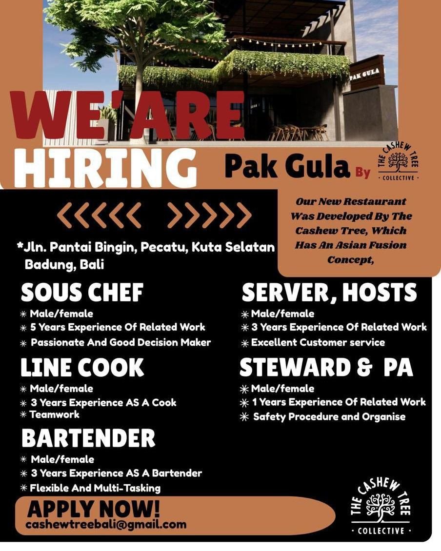 Bagi para pencari kerja yang memiliki gairah di dunia kuliner dan memenuhi persyaratan tersebut, ini merupakan kesempatan emas untuk bergabung dengan grup kolektif yang inovatif. Berkas lamaran dan CV terbaru dapat segera dikirimkan melalui alamat email resmi di cashewtreebali@gmail.com. Pastikan Anda mencantumkan posisi yang dilamar pada subjek email untuk memudahkan proses seleksi oleh tim manajemen Pak Gula.