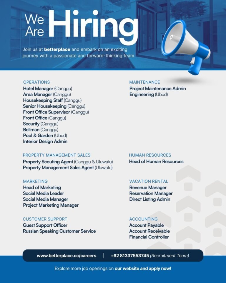 LOKER.BALINEWS.ID, BALI – Betterplace, sebuah perusahaan manajemen properti yang sedang berkembang pesat, saat ini membuka kesempatan karir besar-besaran untuk mengisi berbagai posisi strategis di wilayah Bali. Perusahaan mengundang para profesional yang memiliki semangat tinggi dan pemikiran maju untuk bergabung dalam tim mereka yang dinamis. Lowongan yang tersedia mencakup berbagai departemen operasional, mulai dari tingkat manajerial seperti Hotel Manager dan Area Manager untuk wilayah Canggu, hingga staf teknis seperti Engineering di Ubud serta Pool & Garden.